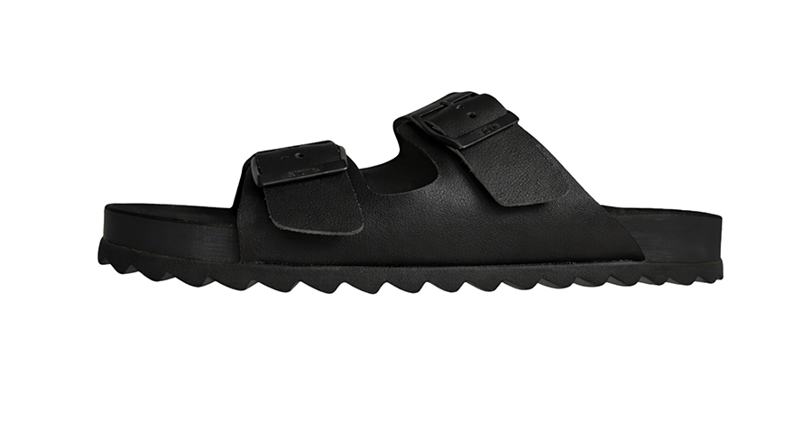 Una sandalia de estética minimalista y completamente negra que se integra fácilmente en cualquier estilo. Su estructura ergonómica brinda estabilidad, soporte y confort en cada paso.