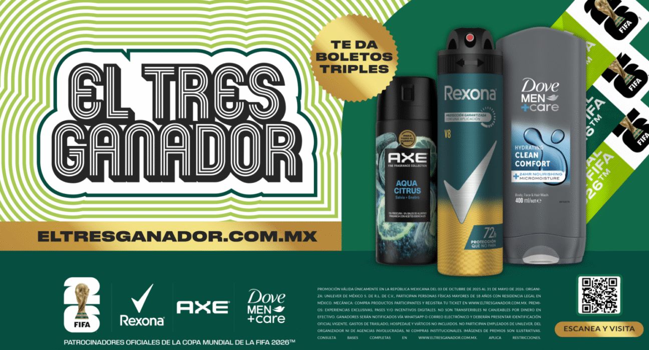 El fútbol no se vive, se siente. Y cuando México vuelve a ser anfitrión de la Copa Mundial de la FIFA™ por tercera ocasión, la pasión se triplica. Con ese espíritu, Rexona, Axe y Dove —tres marcas icónicas de Unilever— presentan «El Tres Ganador», una promoción inédita que regalará 184 pases triples para asistir a los partidos (en México) del torneo más esperado del planeta, además de más de 3,000 premios adicionales.